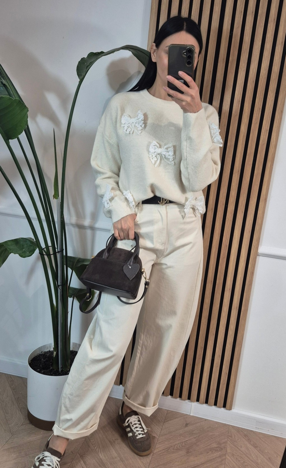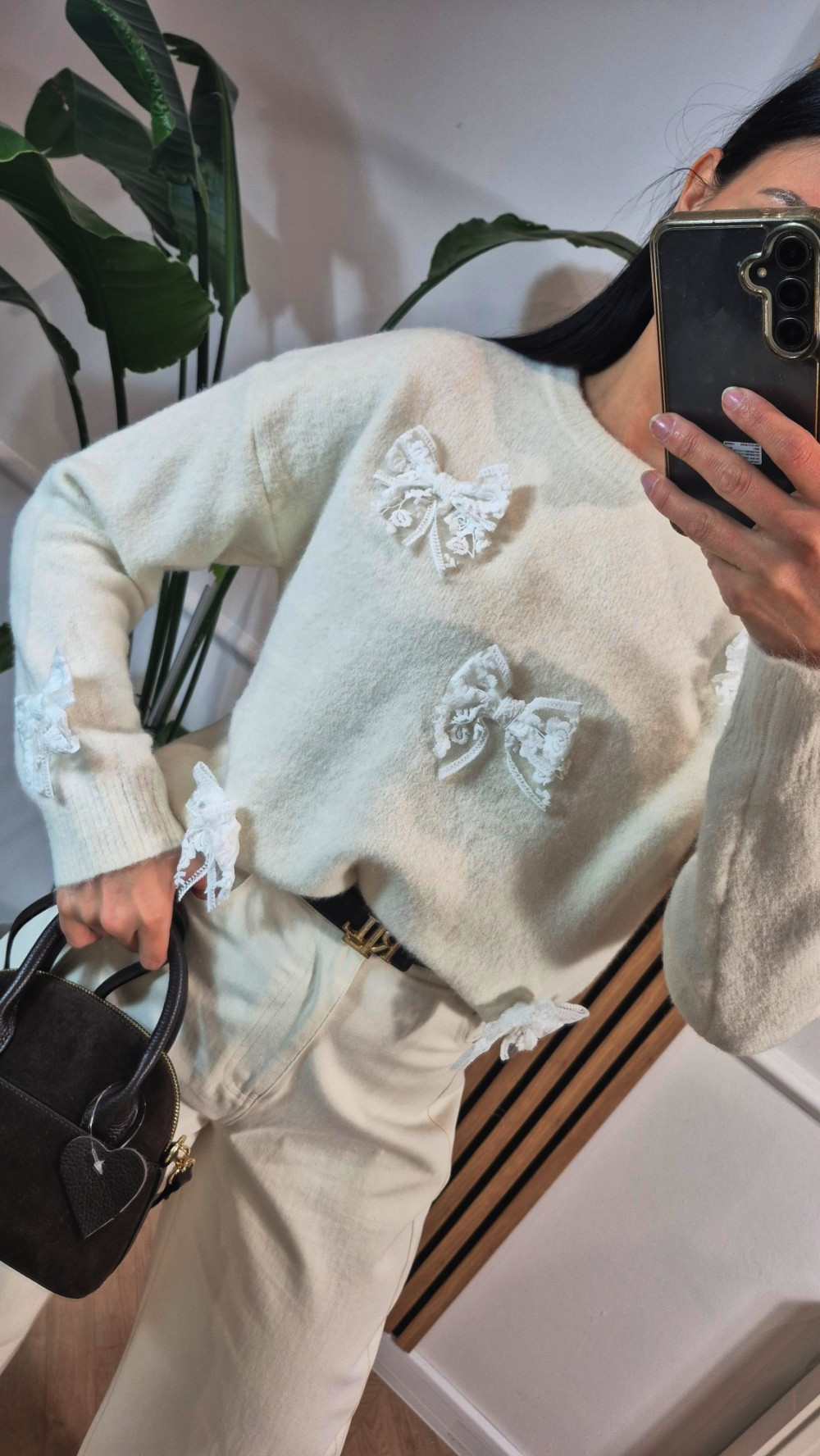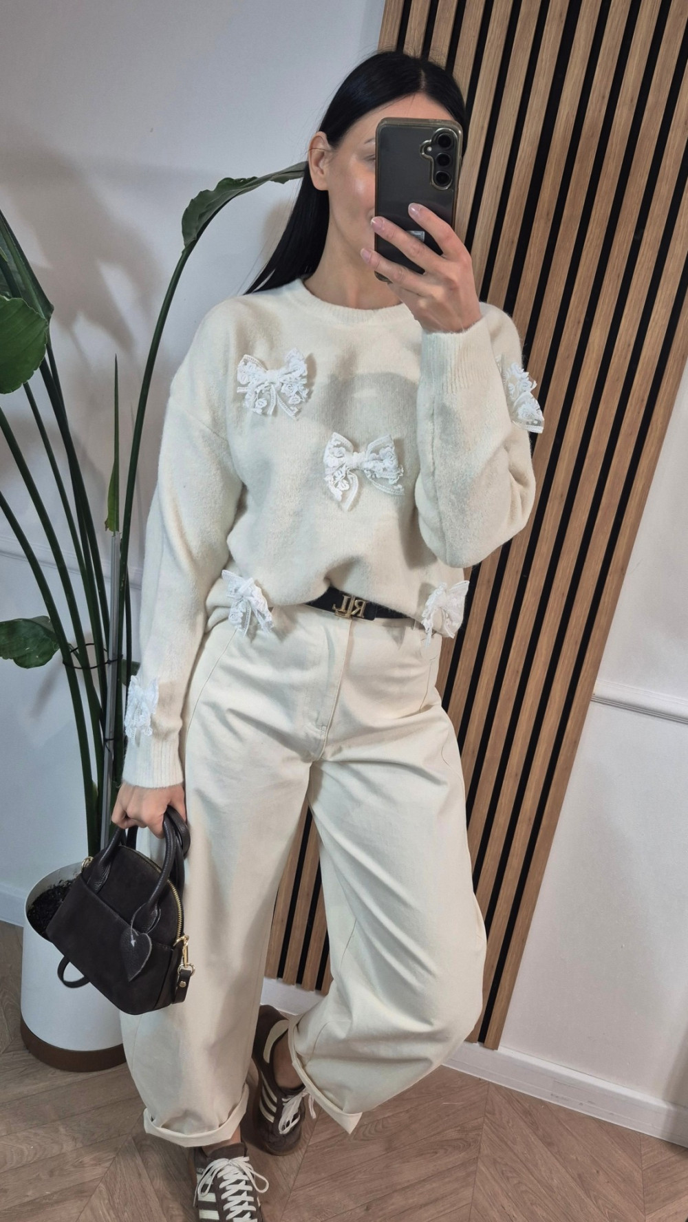 Sweter z kokardkami koronka beż