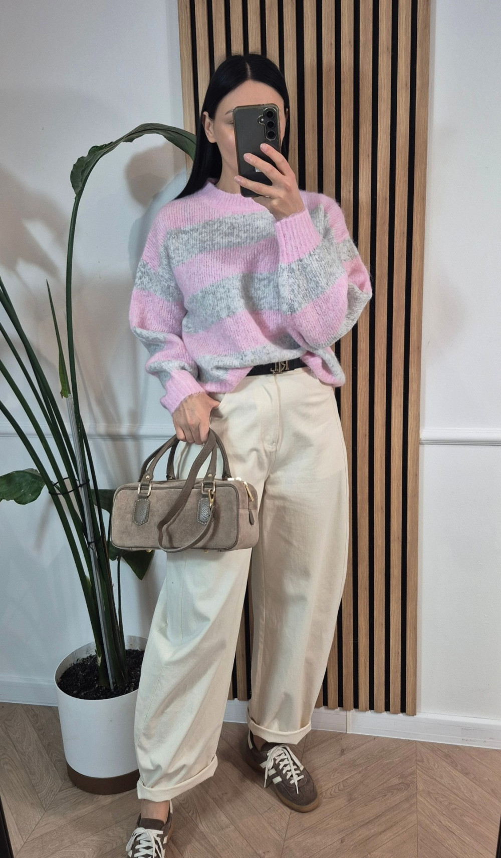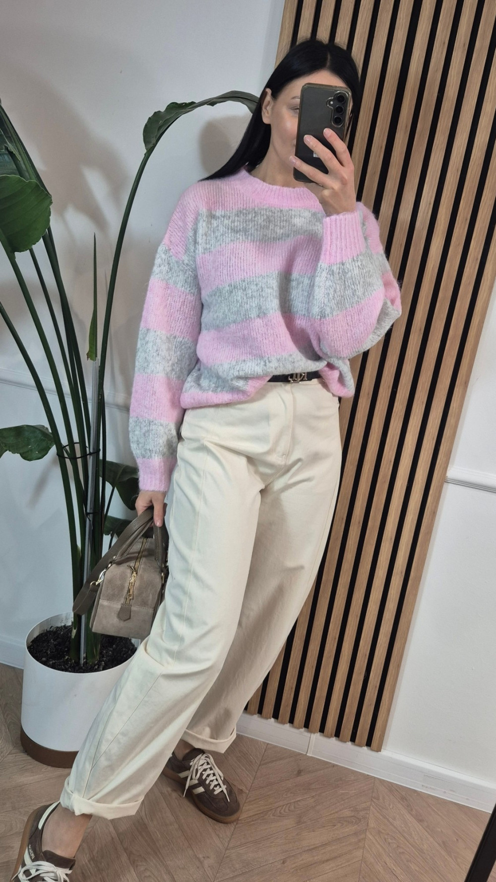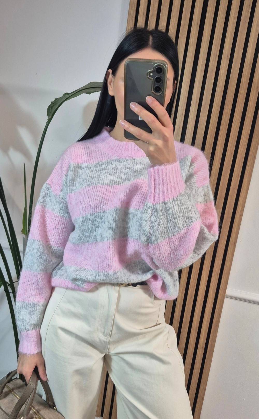 Sweter pasy różowo szary