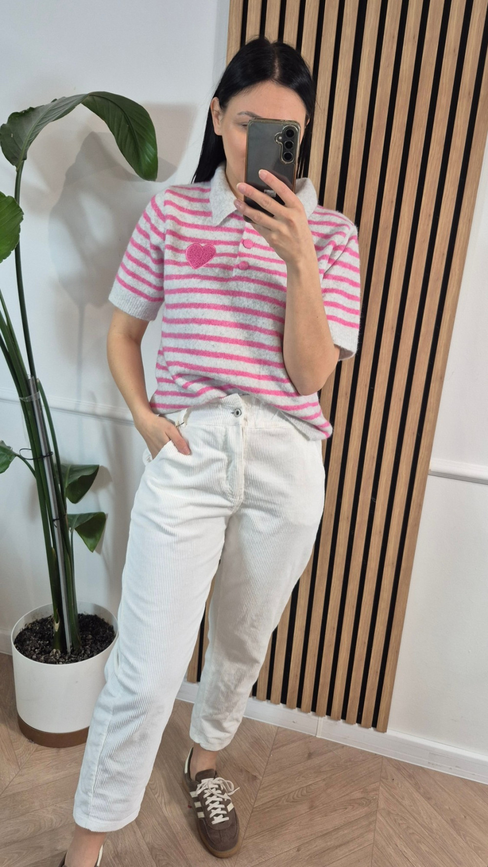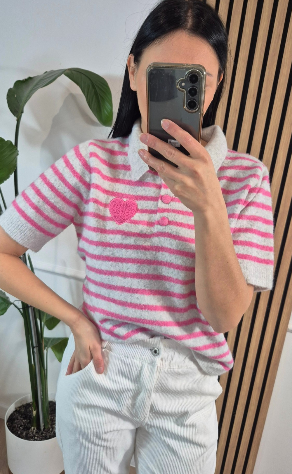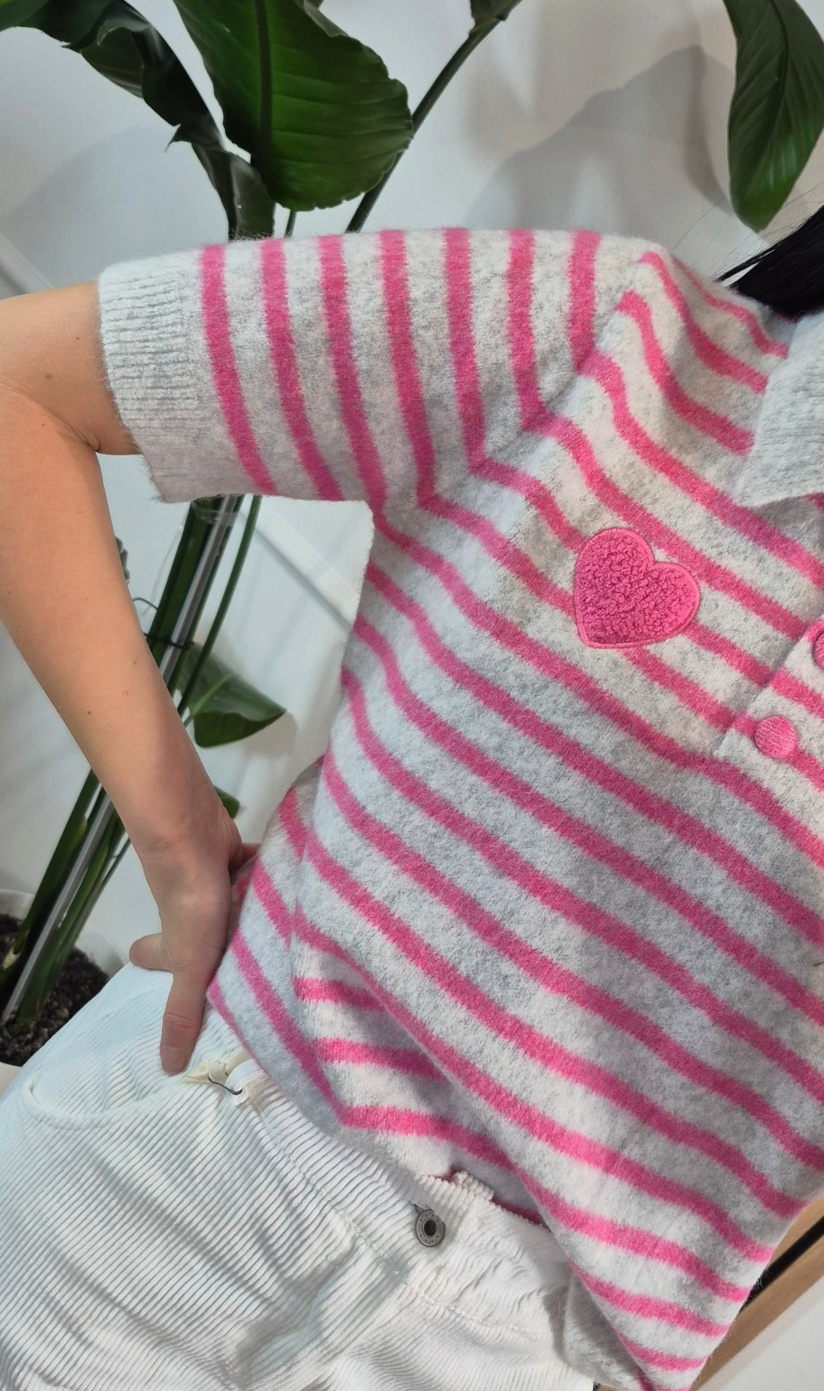 Sweter polo w paseczki róż